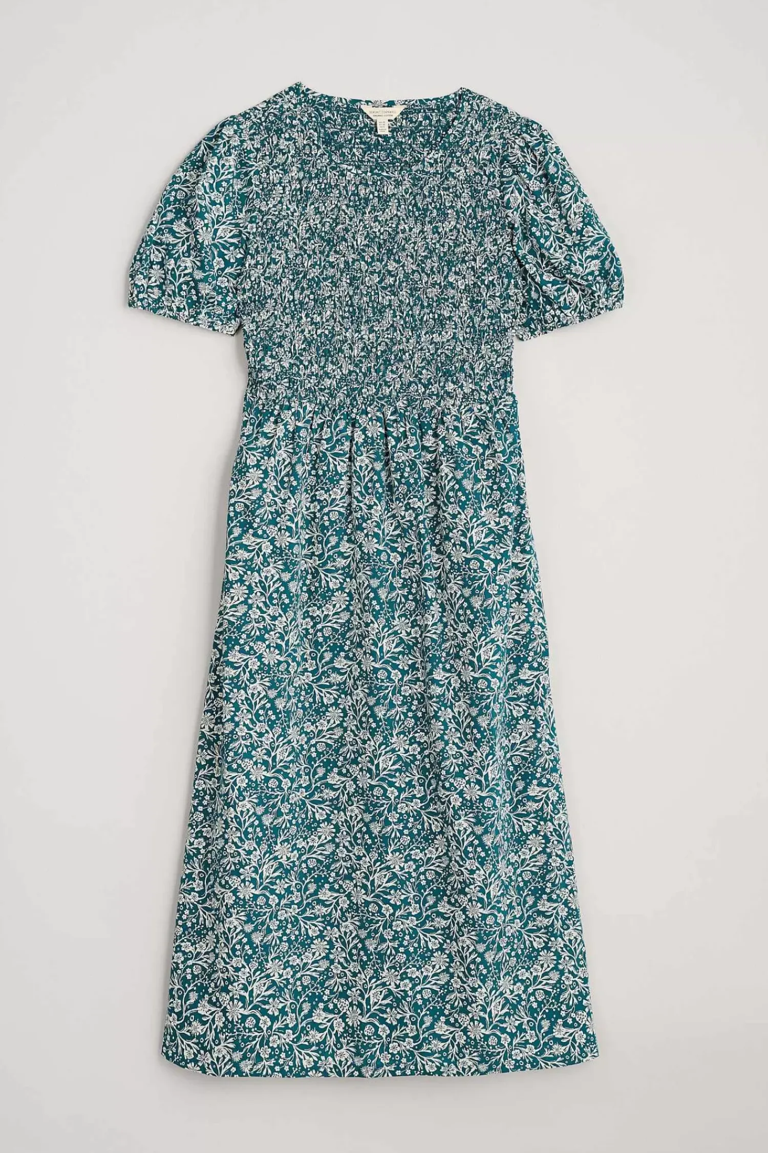A Versatile Summer Dress That Blends Elegance And Ease, With A Smocked Bodice And Full, Above-The-Ankle Skirt. The Short Sleeves Have An Elasticated Cuff Which Gives Them A Subtle Volume.